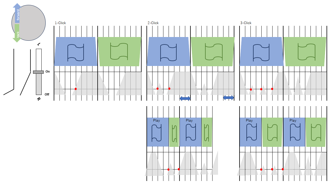 結果、音の出るタイミングというのは、フェーダがONのとき、ONの状態でテーブルのForward->BackおよびBack->Forwardの切り替わりの瞬間ということになります。