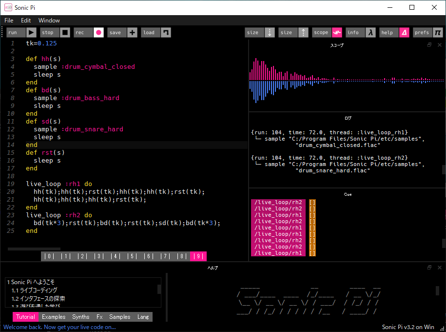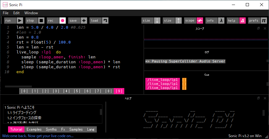 最後にSonicPiにもどって、フレーズサンプリングがループサイズに足りていない様子をライブコーディングしてみました。