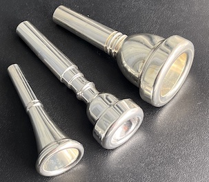 (左からホルン、トランペット、トロンボーンのマウスピース。音色を特徴づけるためとても重要なパーツ。トロンボーンにトランペットのマウスピースをつけるとトランペットの音がする・・)