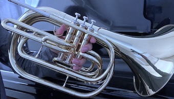 ここで一ひねりして通常のフレンチホルンでなく、ベルが前を向いているマーチングフレンチホルンを選択しました。トランペットと同じBb管で運指も互換があり、演奏スタイルも同じだからです。(左手でバルブをおさえるホルンとちがい学習コストがさがる??) F管のホルンの楽譜を読むときは変換が必要になりますが・・