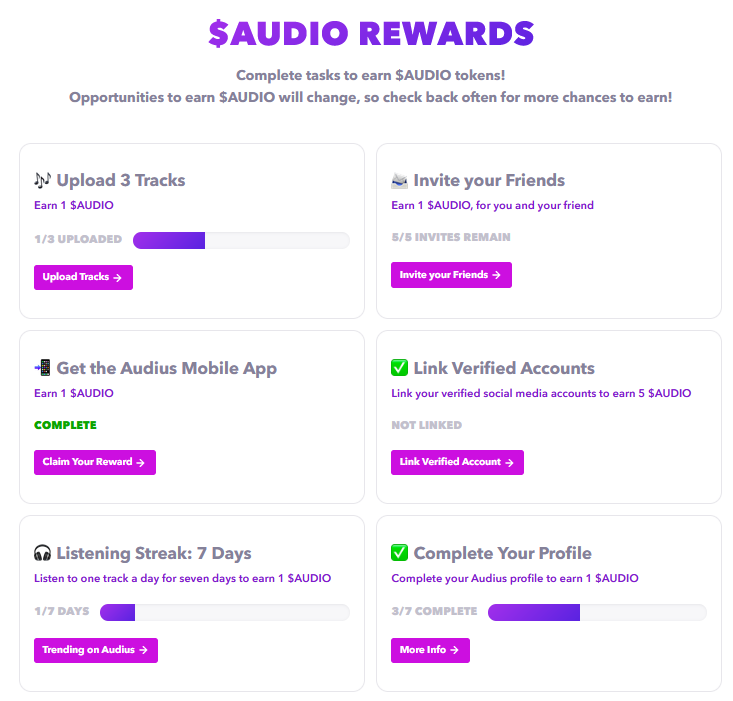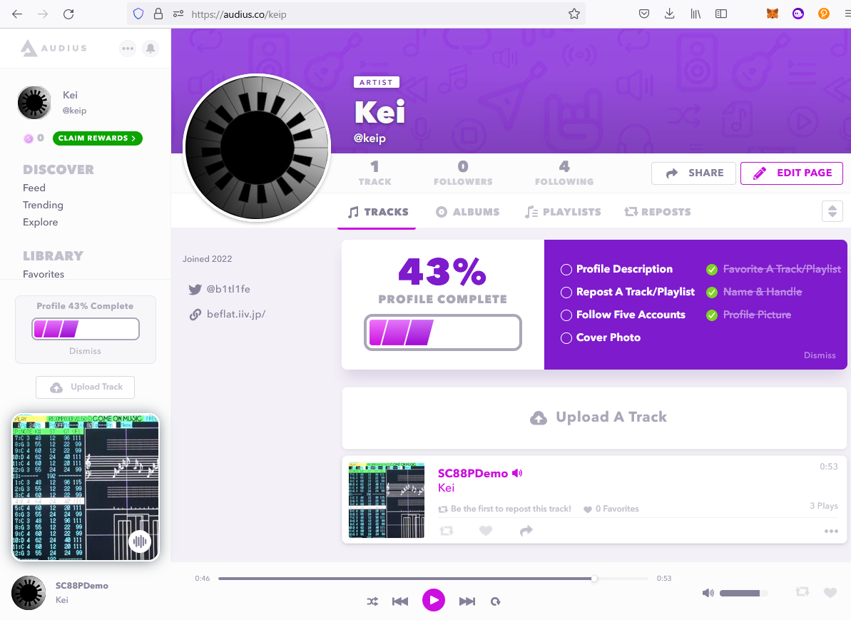 これまでのサービスと違うところは、音楽をアップロードしたりと曲を聴いたりするなど、さまざまイベントをこなすと暗号通貨$AUDIOで報酬を受け取れるということです。(請求していない今はゼロです)