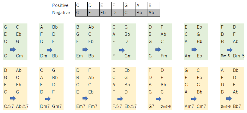 話が脱線しましたが、ネガティブハーモニーの仕組みを図示しました。