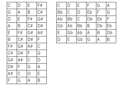 リディアンスケールを左図のようなルールでつなげていくもの(5度圏の#側(陽))と、ミクソリディアンスケールを右図のようなルールでつなげていくもの(5度圏のb側(陰))で、オクターブをまたいで変化していく様子が興味深いです。